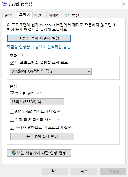 그리고 아래 그림과 같이 호환성 변경을 해주세요.