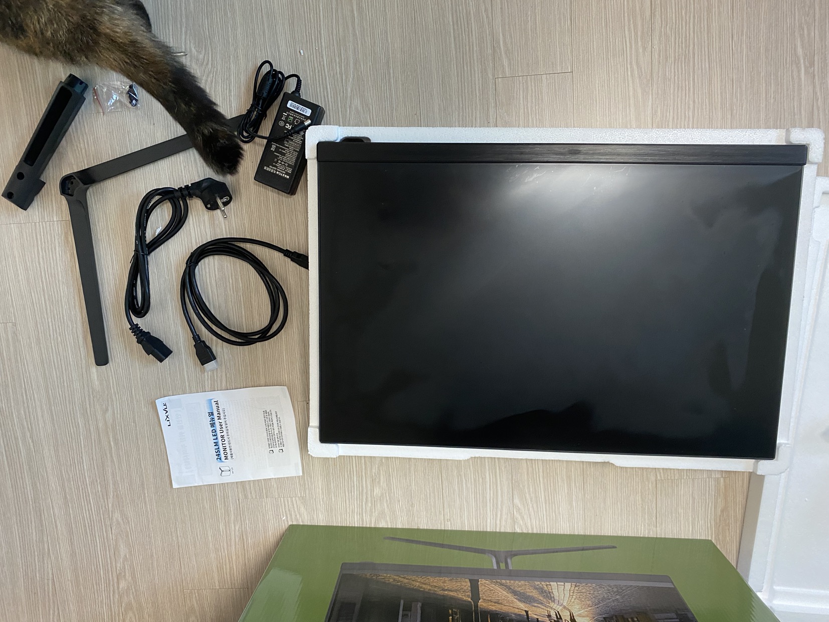 구성품입니다. 24인치 모니터와 HDMI케이블, 전원 케이블, 어댑터, 모니터 지지대, 십자 나사가 들어있습니다.